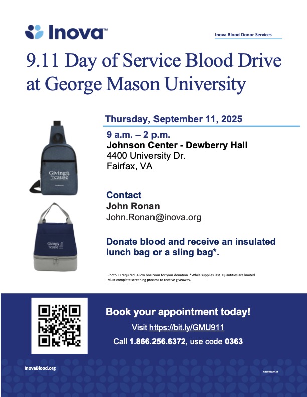 We are excited to partner with INOVA Blood Donor Services to host the 9/11 Day of Service Blood Drive at George Mason University. If you are interested in donating blood, please register be sure to book an appointment online at: https://www.inovabloodsaves.org/donor/schedules/drive_schedule/34362.